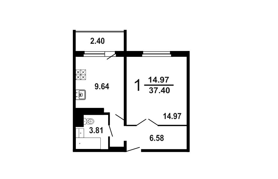 - 1-ком. кв.: 37,40 / 14,97 / 9,64 кв. м