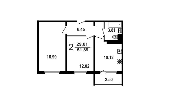 - 2-ком. кв.: 51,89 / 29,01 / 10,12 кв. м