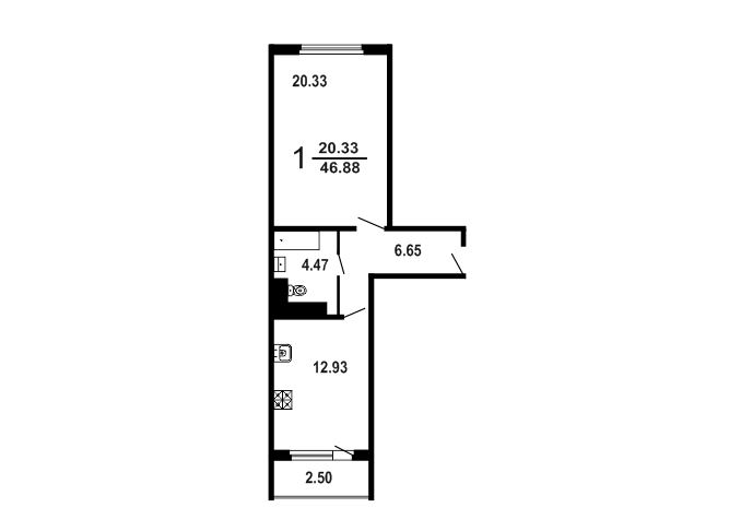 - 1-ком. кв.: 46,17 / 20,00 / 12,68 кв. м