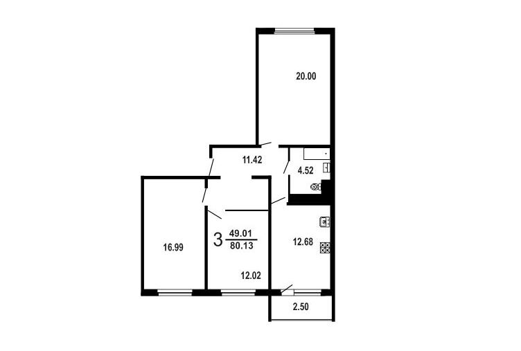 - 3-ком. кв.: 80,13 / 49,01 / 12,68 кв. м