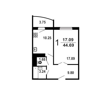 1-ком. квартира: 44,69 / 17,09 / 10,25 кв. м