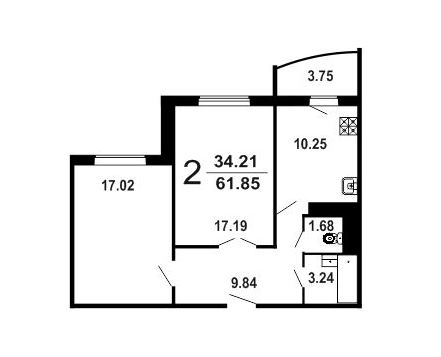 2-ком. квартира: 61,40 / 34,21 / 10,25 кв. м