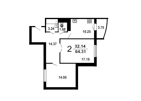 2-ком. квартира: 63,86 / 32,14 / 10,25 кв. м