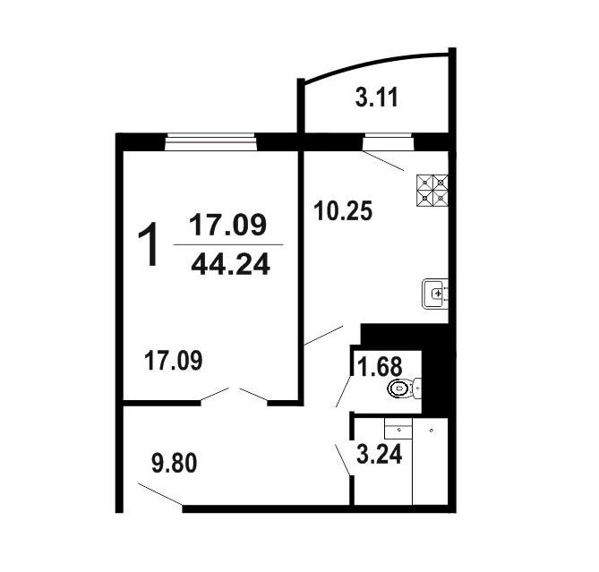 1-ком. квартира: 44,24 / 17,09 / 10,25 кв. м