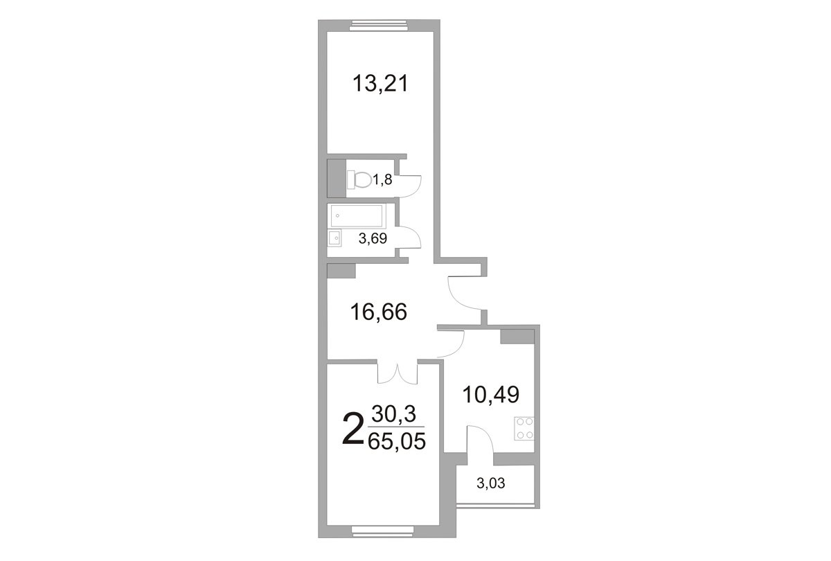 2-ком. квартира: 65,05 / 62,9 / 30,30 / 10,49 кв.м.