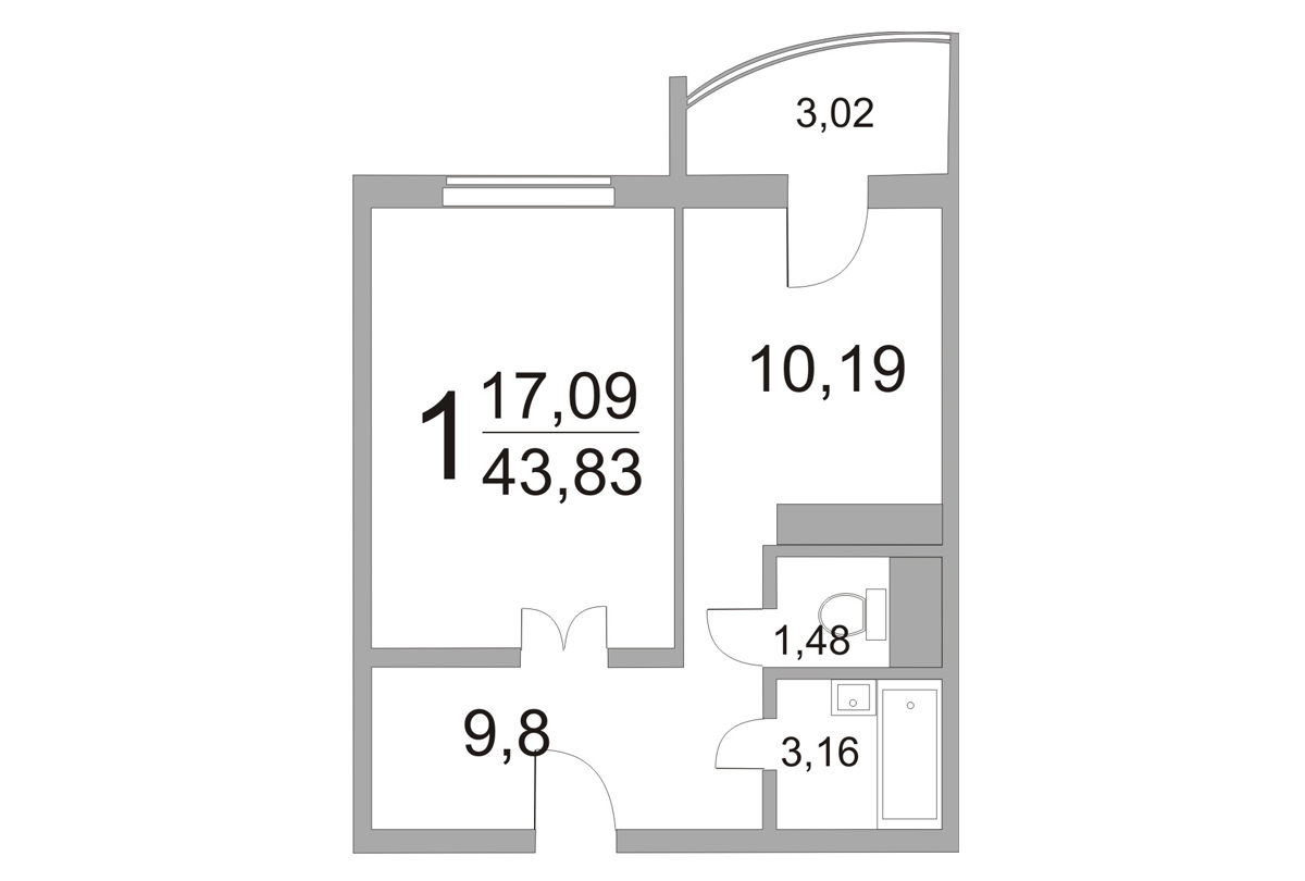 1-ком. квартира: 43,83 / 41,7 / 17,09 / 10,19 кв.м.