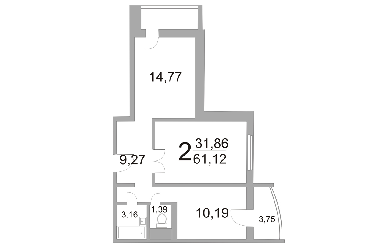 2-ком. квартира: 61,12 / 56,1 / 31,86 / 10,19 кв.м.