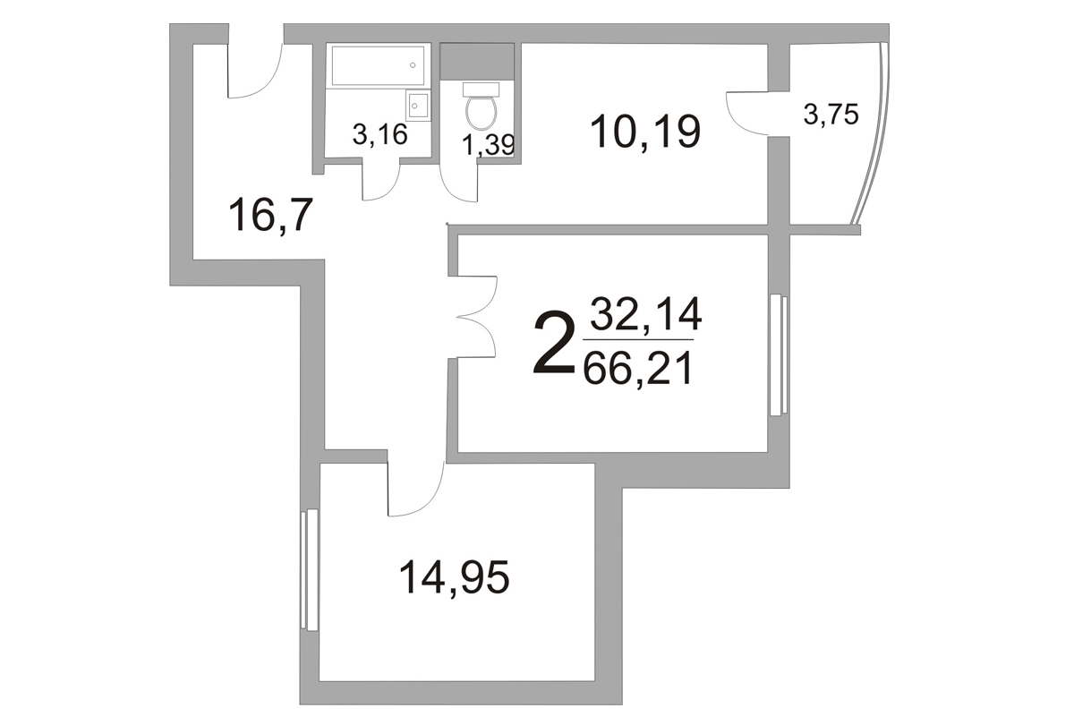 2-ком. квартира: 66,21 / 63,6 / 32,14 / 10,19 кв.м.